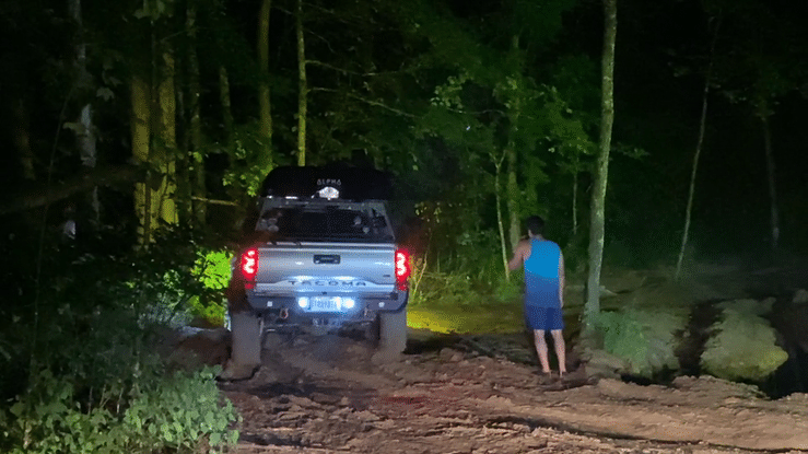 I’d been a passenger on this trail before but never a driver and also never at night. It gets dark in the woods and adds another level of terror and stress to navigating your daily driver over and in between logs, rocks and muddy water. We met up at Sky Bridge Station for dinner and after some quick planning we headed out into the night for a muddy misadventure.