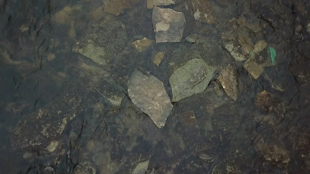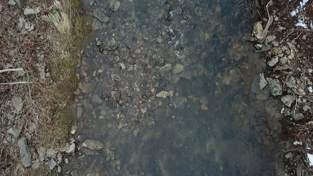 After fishing the honey hole pretty hard for an hour, I started looking for a place to take the drone up. I didn’t wear waders today, so I moved downstream to find a place to cross in just my muck boots. The water was moving fast but was shallow enough to cross over and explore the middle area of the park. Spider ice on the side creeks was a sight to see. Also interesting was finding evidence of the hunt and stalk of a now-devoured robin. Possibly by a bobcat.